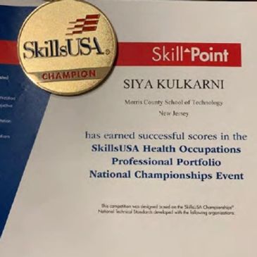 Siya won first place nationally for the SkillsUSA competition for Health Occupations Professional Portfolio. She compiled a portfolio detailing experiences and awards related to the health field and gave an interview with a panel of judges.